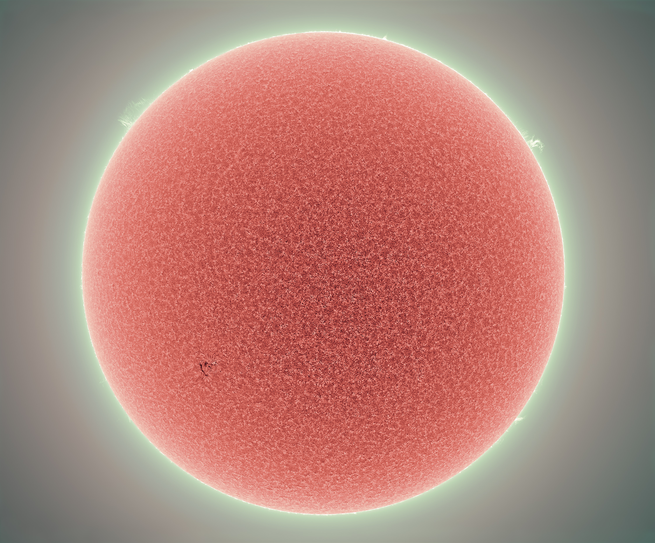 This rose colored sun was captured on March 8, 2020 and processed on Easter Sunday. The little disruption at lower left is active region AR2758, identified by its reversed polarity to be a member of new Solar Cycle 25. Its appearance reminds us that activity, still deep in the throes of minimum, will return on the sun and on the earth too. A rosy and hopeful Holiday to all.
