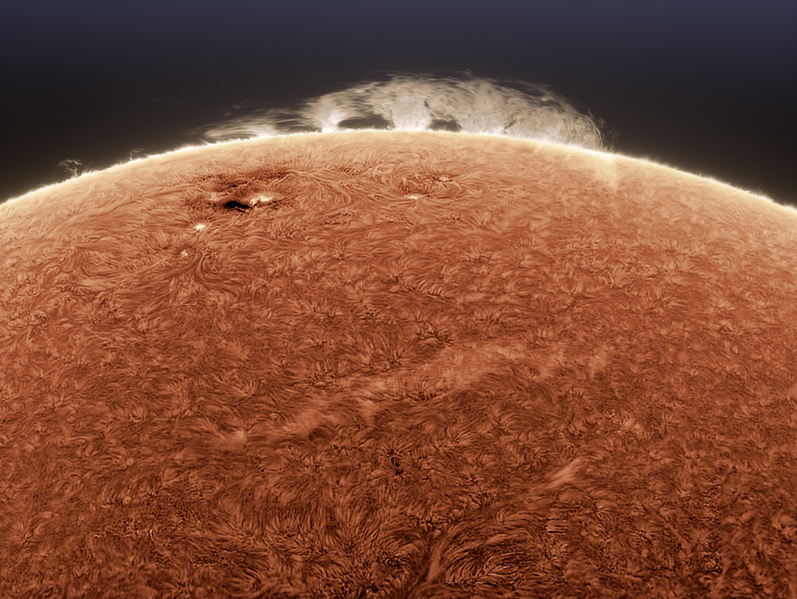 A long dramatic prominence snakes across the edge of the sun... it can be seen to begin against the disk and arch over the limb. It is at least 200,000 miles long, perhaps longer.