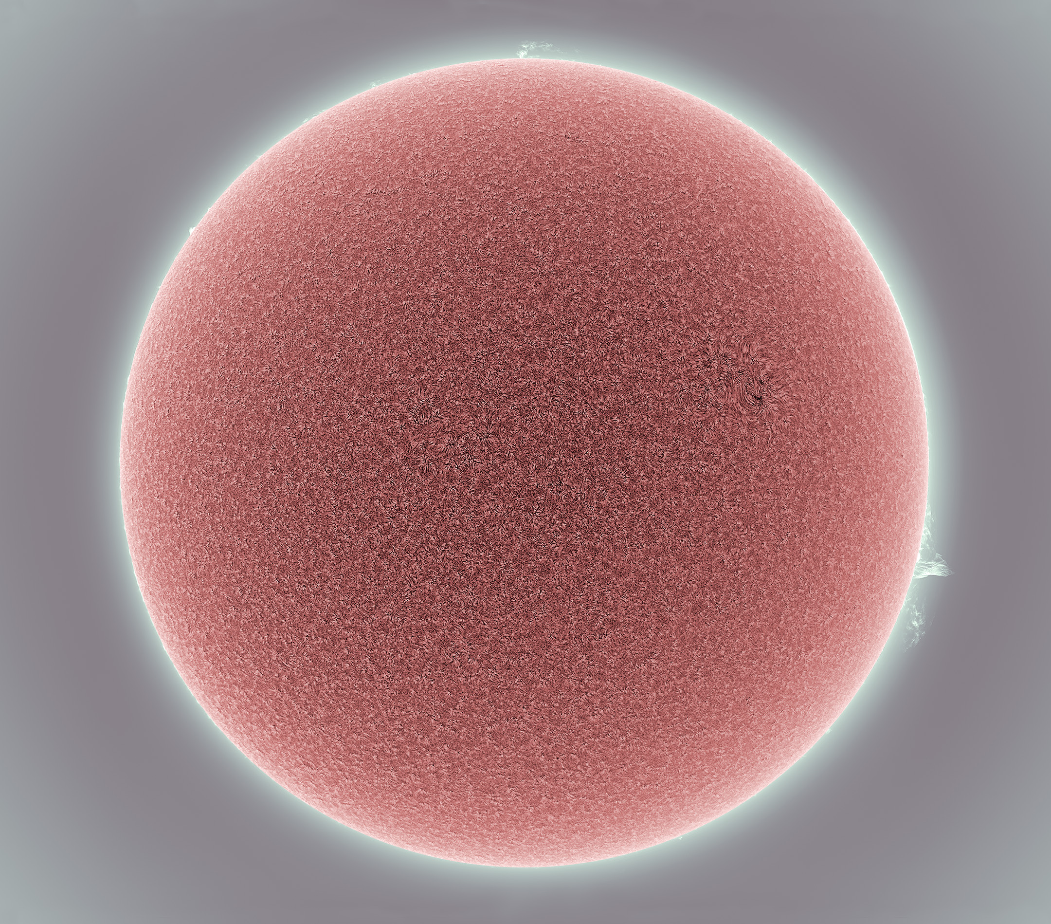 Portrait of a quiet sun on Memorial Day weekend showing a small disruption on the chromosphere and two nice prominences. A close-up of the large prominence can be seen here.