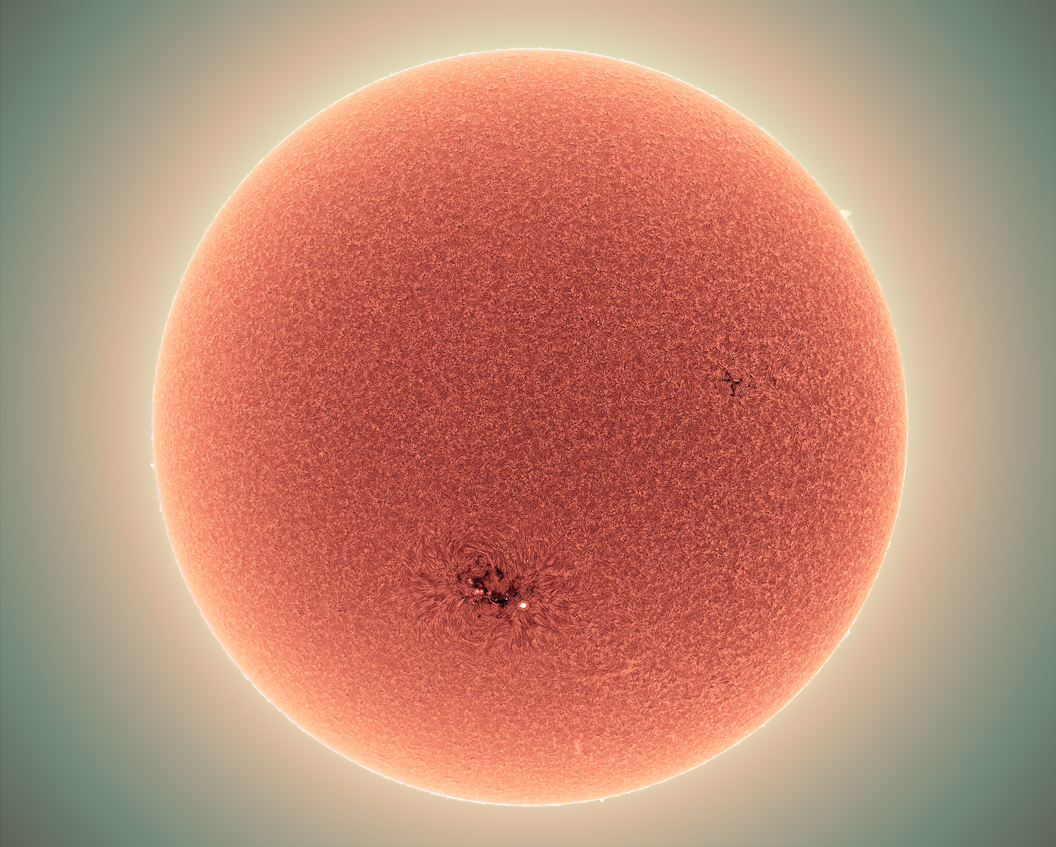 Portrait of the sun, low in the November sky, sporting two solar cycle 25 active regions, the large sunspot group AR2781 and the small disruption numbered as AR 2780. A larger version can be seen here.