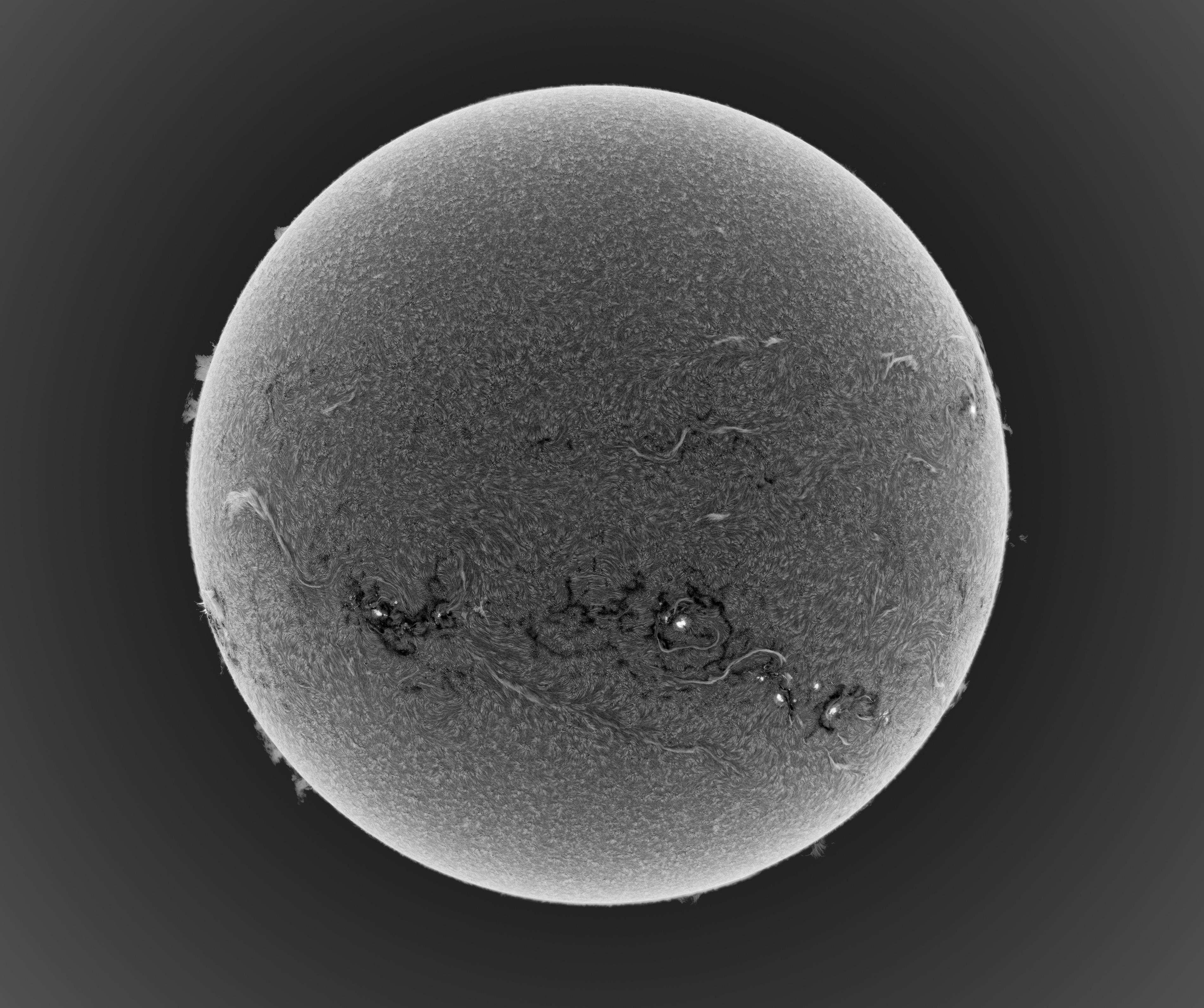 The sun on September 5, 2024... mosaic of four captures recorded through my 90mm solar telescope at a focal length of 1800mm.A non-inverted version can be seen here.