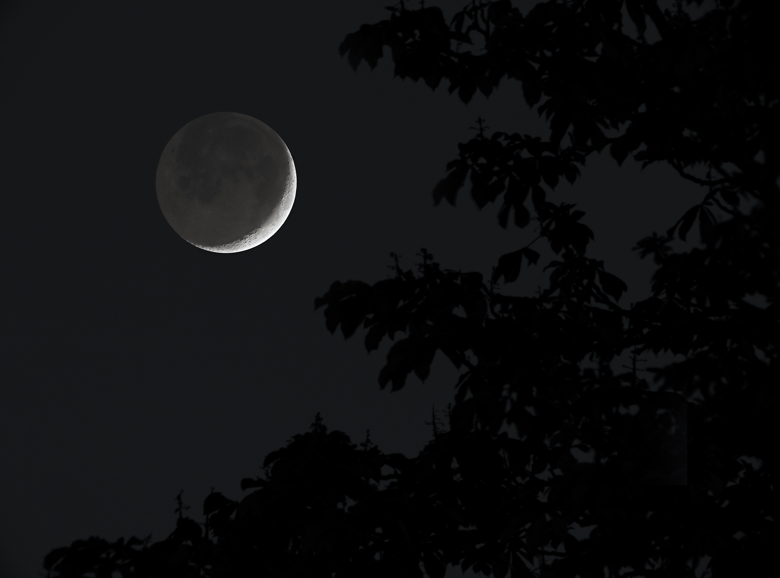 The waxing crescent moon illuminated by sunshine and earthshine.