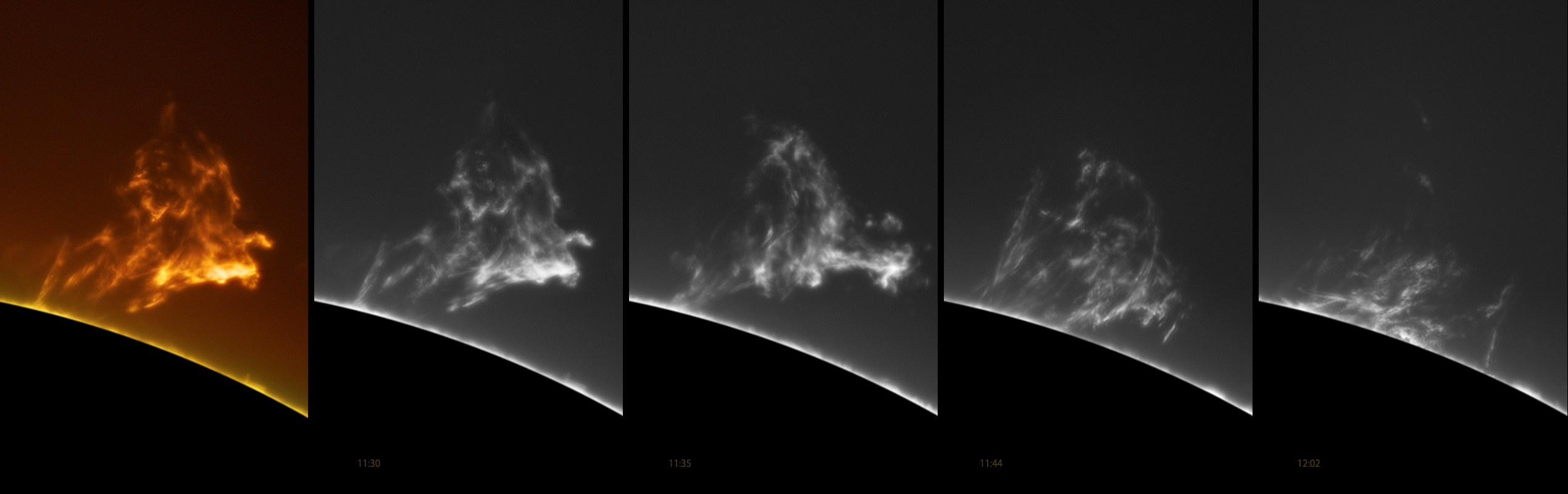 A beautiful and fast moving eruptive prominence observed today... at its height, 100,000 miles above the surface of the sun. In 30 minutes, it had collapsed back into the solar chromosphere. Bad Astronomer Phil Plait blogged this photo at Discover. See an animation of the collapse here.